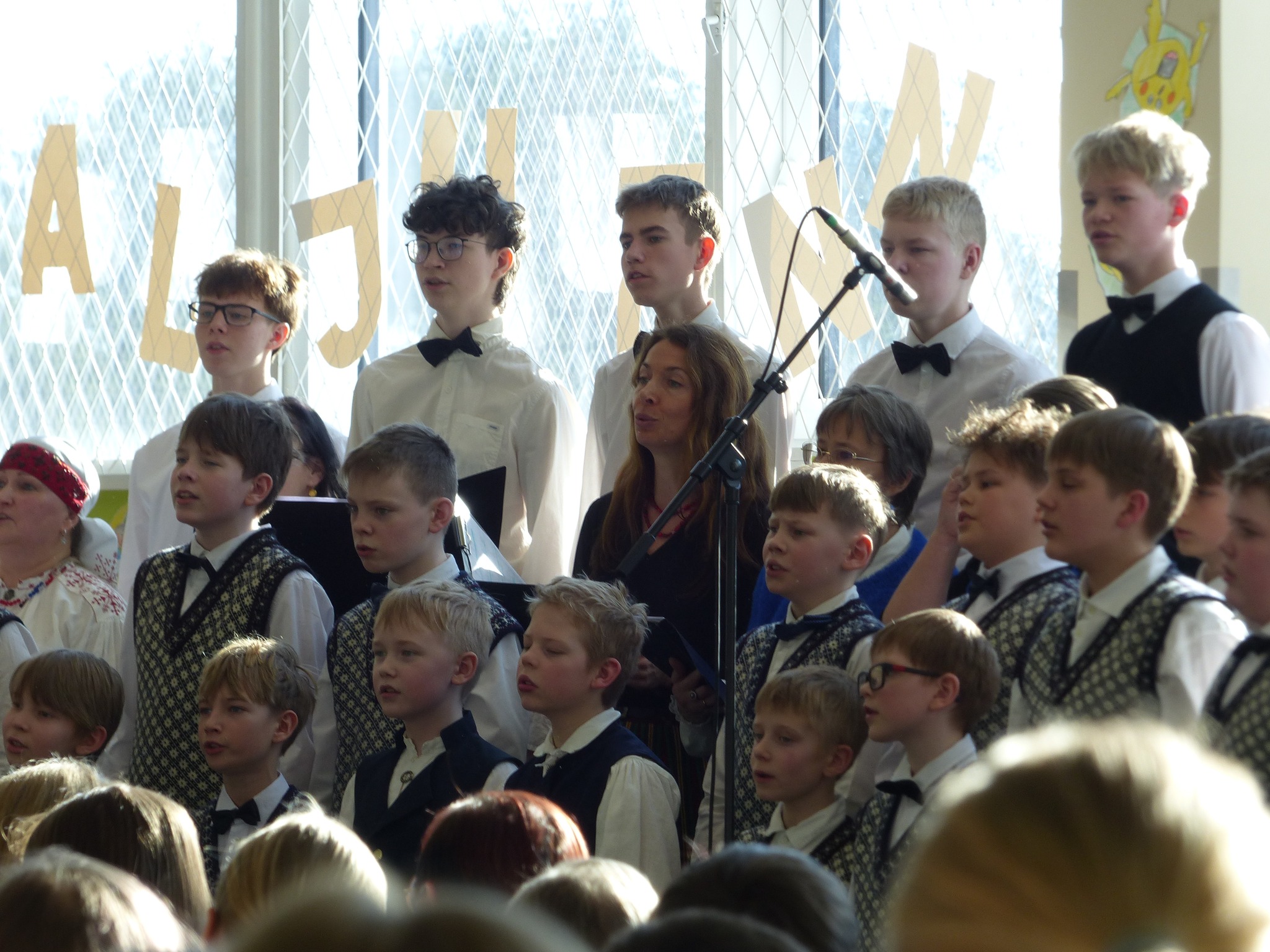 Võimlas toimus kogu kooli ühine aktus, kus esinesid solistid, koorid, rahvatantsijad, draamaringi õpilased ja oma kõned esitasid 9.a klassi õpilased Kaspar Karu ja Gerdo Mälga. Lisaks esinemistele tunnustasime aktusel traditsiooniliselt 5-kooli matemaatikavõistluse ja Meidlate nuputamisvõistluse parimaid.