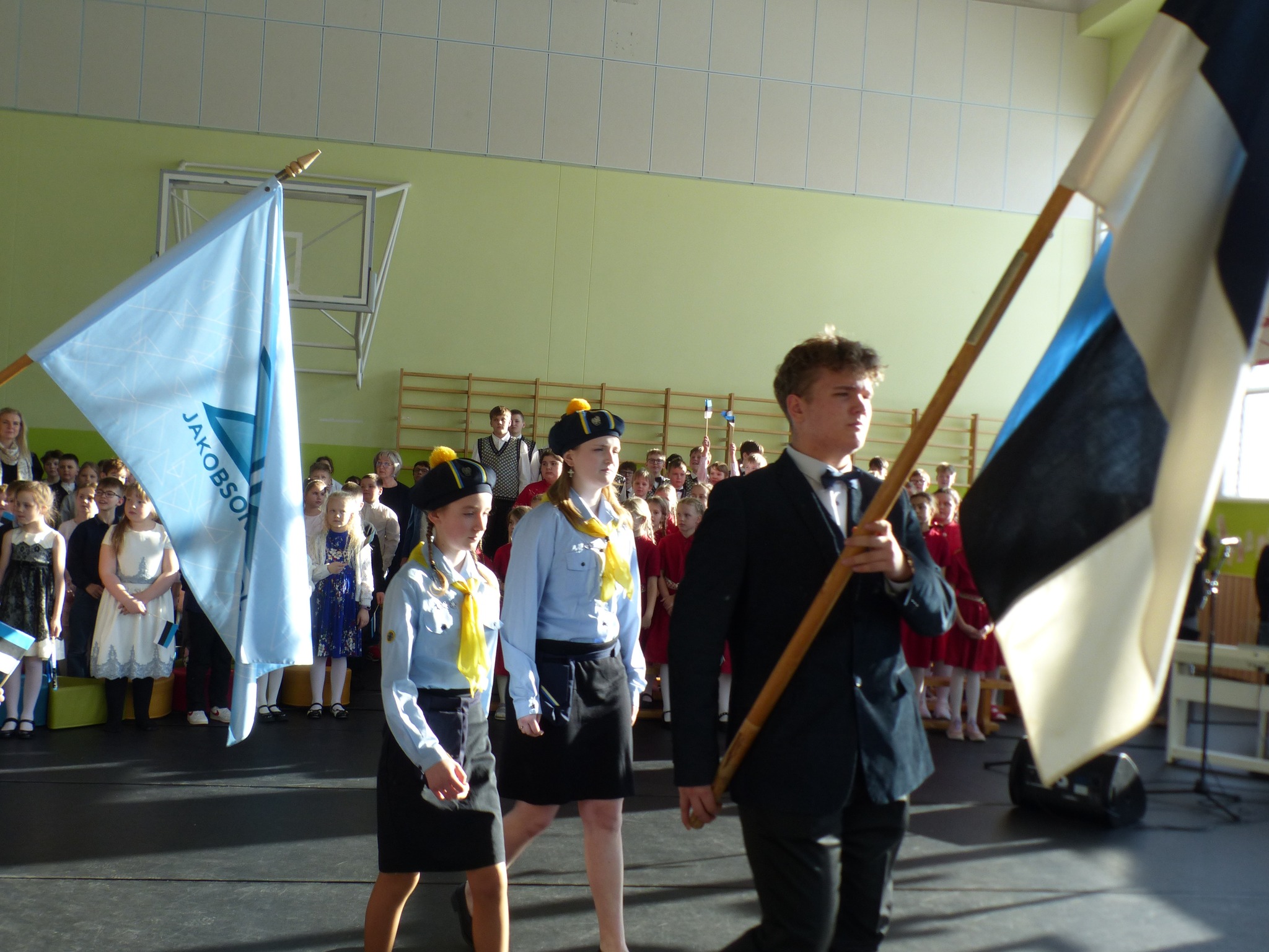 Võimlas toimus kogu kooli ühine aktus, kus esinesid solistid, koorid, rahvatantsijad, draamaringi õpilased ja oma kõned esitasid 9.a klassi õpilased Kaspar Karu ja Gerdo Mälga. Lisaks esinemistele tunnustasime aktusel traditsiooniliselt 5-kooli matemaatikavõistluse ja Meidlate nuputamisvõistluse parimaid.